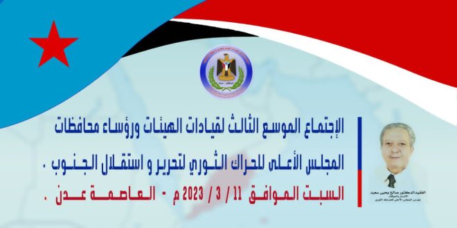 ينعقد صباح غدا السبت الاجتماع السياسي الهام للمجلس الأعلى للحراك الثوري لتحرير واستقلال الجنوب، بتوجيهات من رئيس المجلس المناضل عبدالرؤوف زين السقاف.