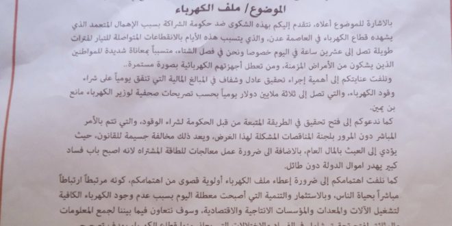 بالاشارة للموضوع أعلاه، نتقدم إليكم بهذه الشكوى ضد حكومة الشراكة بسبب الإهمال المتعمد الذي يشهده قطاع الكهرباء في العاصمة عدن، والذي يتسبب هذه الأيام بالانقطاعات المتواصلة للتيار لفترات طويلة تصل إلى عشرين ساعة في اليوم خصوصا ونحن في ايام الشتاء، متسبباً بمعاناة شديدة للمواطنين الذين يشكون من الأمراض المزمنة، ومن تعطل أجهزتهم الكهربائية بصورة مستمرة..