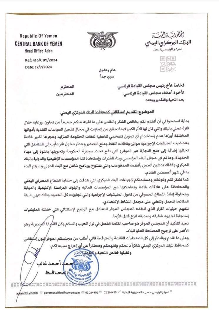 قدم اليوم الثلاثاء، الاستاذ احمد غالب المعبقي، رئيس مجلس إدارة البنك المركزي اليمني، استقالته من رئاسة البنك، بعد يوم واحد من قبول مجلس القيادة الرئاسي بإلغاء القرارات التي أصدرها البنك منذ شهرين لمعالجة الوضع المالي وتوحيد العملة الوطنية في البلاد.