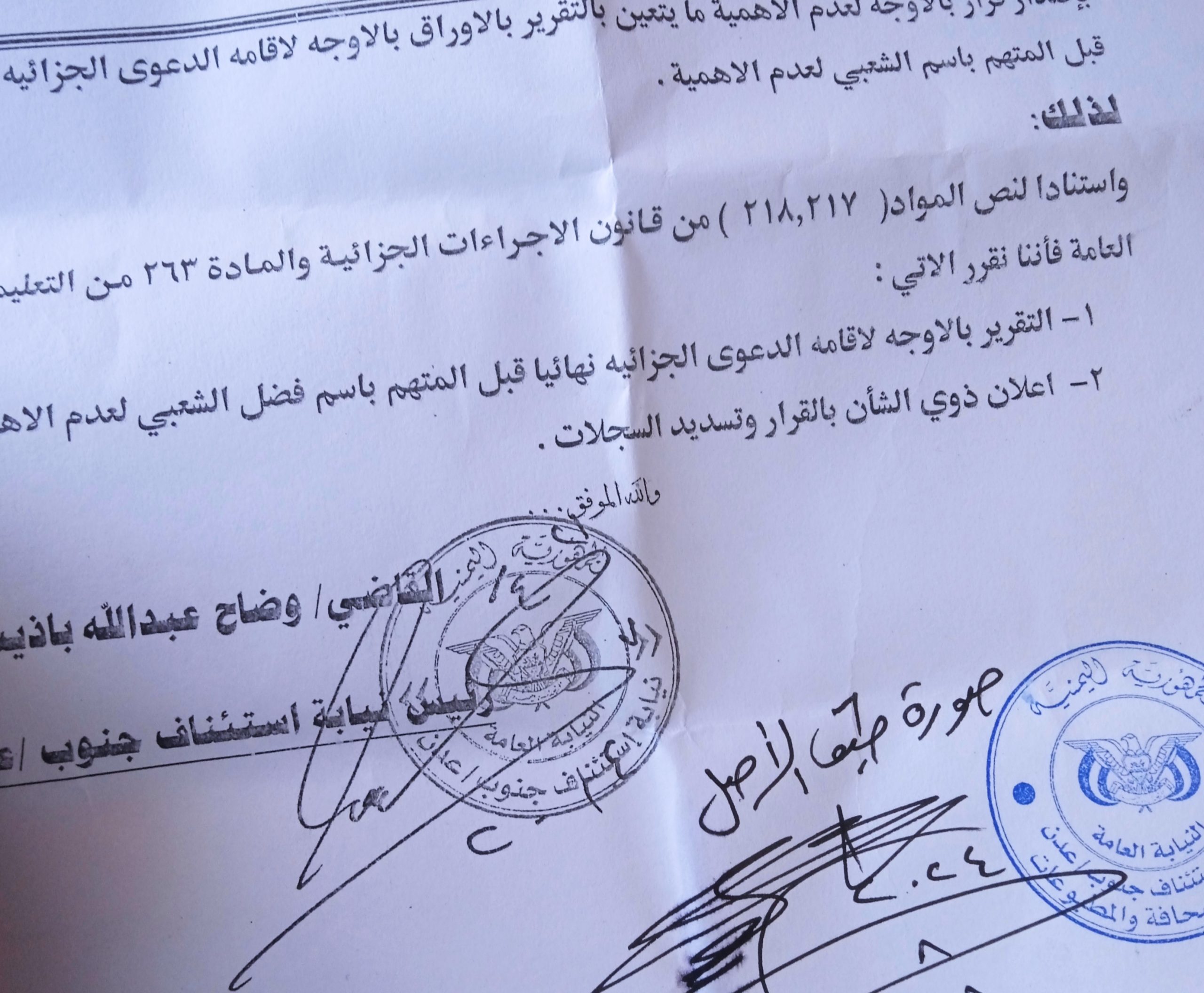 وقالت نيابة استئناف جنوب عدن في قرارها أنه لا وجه لإقامة الدعوى الجزائية نهائيا، مؤكدة أن ملف القضية أحيل للحفظ النهائي، ما يعني أن القضية انتهت مكانيا وزمانيا.