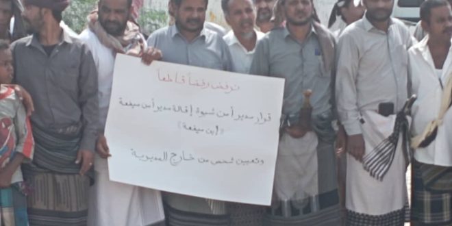 تشهد مديرية ميفعة بمحافظة شبوة منذ يوم امس، تظاهرات حاشدة ترفض قرار إقالة العقيد محمد صالح الفانوص، مدير أمن المديرية، الذي صدر أمس الأول قرار بإقالته واستبداله يشخص من خارج المديرية.