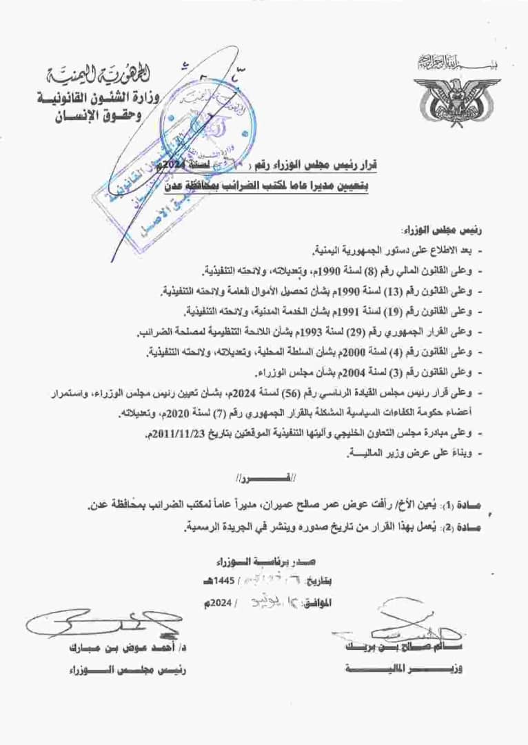 مايزال عبدالحكيم معاون المدير السابق لمكتب الضرائب في العاصمة عدن، يرفض تسليم المكتب ومغادرة المنصب رغم صدور قرارين بتغييره، الاول من محافظ العاصمة عدن احمد لملس بتاريخ 7 ابريل 2024، والثاني من رئيس مجلس الوزراء، الدكتور أحمد بن مبارك، بتاريخ 2يونيو من العام الجاري، وكلا القرارين صدرا بتعين الاستاذ رافت عميران، مديرا لمكتب ضرائب عدن بديلا لمعاون، إلا أن الأخير يرفض التسليم، الأمر الذي دفع كثيرون للتساؤل ..من يقف خلفه؟