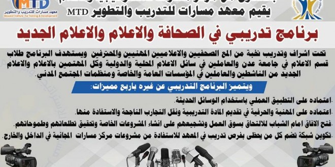 يتواصل في العاصمة عدن البرنامج التدريبي في الصحافة والاعلام والاعلام الجديد الذي ينفذه معهد مسارات للتدريب والتطوير MTD بالتعاون مع مركز مسارات للاستراتيجيا والاعلام ويستهدف طلاب الاعلام في جامعة عدن والمهتمين بالاعلام في المؤسسات الخاصة والعامة ومنظمات المجتمع المدني.