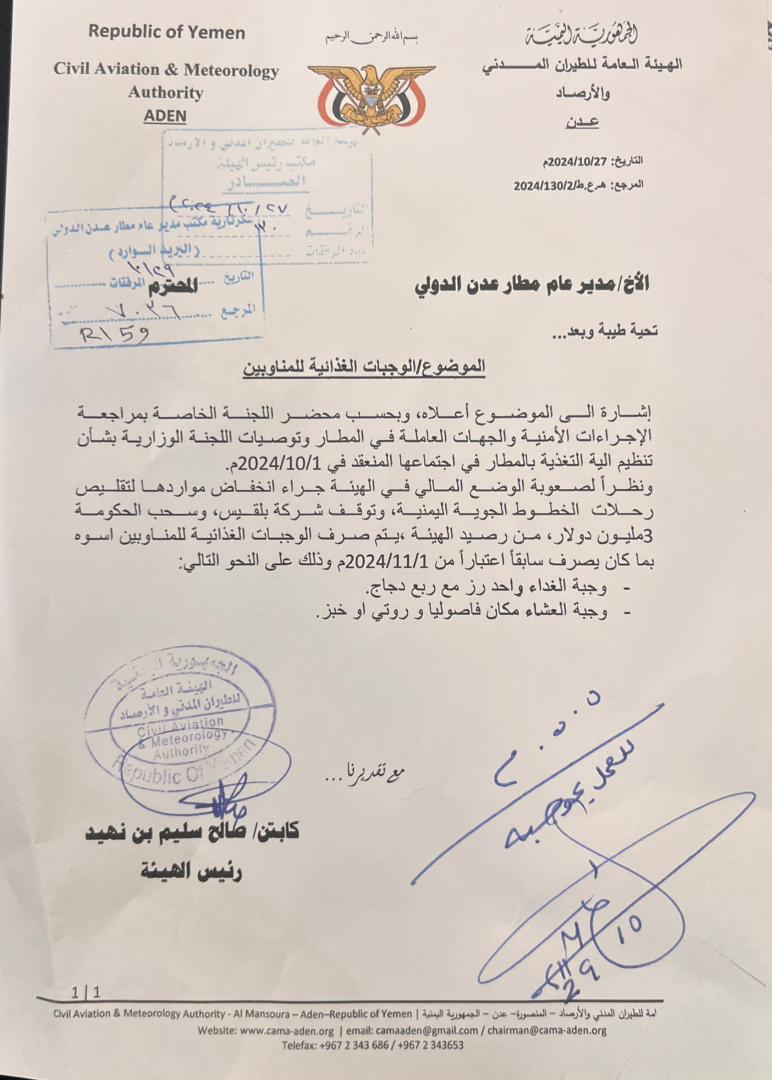 وكان موقع ” مسارات” حصل امس على مذكرة موجهة من رئاسة الهيئة إلى مدير مطار عدن الدولي، باعتماد وجبات للمناوبين من بداية نوفمبر القادم، على أن يكون ” الغداء نفر رز وربع دجاج، والعشاء نفر فاصوليا وروتي او خبز” وما أثار حنق الموظفين أن المذكرة تضمنت ايضا الإشارة إلى أن الحكومة سحبت من رصيد الهيئة ثلاثة ملايين دولار، دون أن توضح المذكرة أسباب ذلك السحب،الامر الذي أثار موجة من السخط في أوساط الموظفين، الذين اعتبروا أن ذلك السحب لم يعد مبررا لهضم حقوقهم.