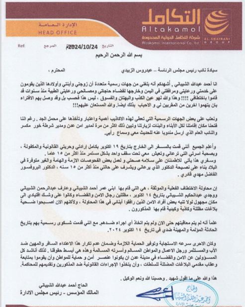 ناشد رجل الأعمال الحاج احمد عبدالله الشيباني، الرئيس عيدروس بن قاسم الزبيدي،رئيس المجلس الانتقالي الجنوبي،ونائب رئيس مجلس القيادة الرئاسي،وكذا الشيخ عبد الرحمن المحرمي، نائب رئيس مجلس القيادة، وقيادات ومسؤولين آخرين في عدن، انصافه رد اعتباره مما تعرض له من محاولة اختطاف من قبل مقربين له، ووقف عمليات الابتزاز المستمرة بحقه.
