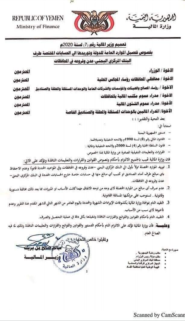مشدد على ضرورة التحرك وباسرع وقت لإغلاق هذه الحسابات المخالفة، وتحويل إيرادات هذه الجهات لحسابات الحكومة في البنك المركزي اليمني، وفق ما ينص عليه القانون الساري في البلاد، محذرا أن التراخي والتهاون في حسم هذا الملف، سوف يعرض الجميع للمسألة القانونية أمام المحاكم المختصة في الداخل والخارج.