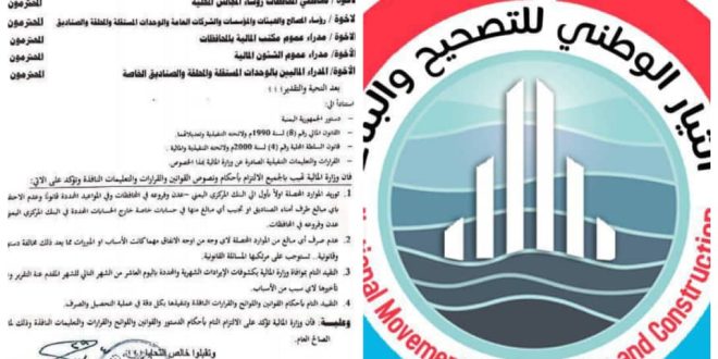طالب التيار الوطني للتصحيح والبناء، النائب العام للجمهورية، القاضي قاهر مصطفى، باستخدام سلطاته للتحرك لإغلاق الحسابات المالية لمؤسسات الدولة المختلفة في العاصمة عدن، والمدن المحررة، المفتوحة في الشركات والبنوك الخاصة، وإحالة رؤساء ومسؤولي هذه الجهات المتورطة في هذه العملية، للنيابات المختصة للتحقيق معهم، باعتبار ما يقومون به مخالفات جسيمة بحق القانون، وتلاعب وهدر مكشوف للمال العام، في الوقت الذي تعاني فيها البلاد من انهيار وشيك اقتصاديا وخدميا، وعجز الحكومة المتكرر من دفع رواتب الموظفين والمتقاعدين.