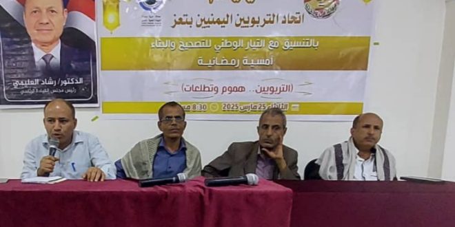 نظم اتحاد التربويين اليمنيين بالتنسيق مع التيار الوطني للتصحيح والبناء القيادة المحلية في محافظة تعز، مساء امس الثلاثاء، أمسية رمضانية ناجحة تحت عنوان ( التربويين هموم وتطلعات ) ، وشهدت الأمسية حضور ممثلي النقابات، وناشطين واعلامين ومنتسبي القطاع التعليمي، وجمع غفير من المهتمين، وذلك بحضور الاستاذ أمين المسني، رئيس الجنة التحضيرية لاتحاد التربويين، والاستاذ عبدالرحمن نصر، رئيس القيادة المحلية للتيار الوطني للتصحيح والبناء بتعز،.
