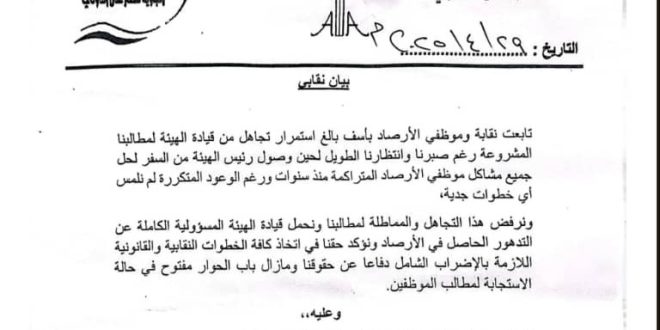 وفي بيان نقابي، عبّر الموظفون عن أسفهم الشديد لما وصفوه بالتجاهل المتعمد والمماطلة المستمرة، مؤكدين أن جميع موظفي الأرصاد يعانون من التهميش والانتقائية من قبل القائم بأعمال وكيل الأرصاد والمحيطين به، الذين همّشوا زملاءهم واستحوذوا على كافة الامتيازات، وفشلوا في تحمّل مسؤولياتهم تجاه المناصب التي مُنحت لهم خلال فترة عملهم.