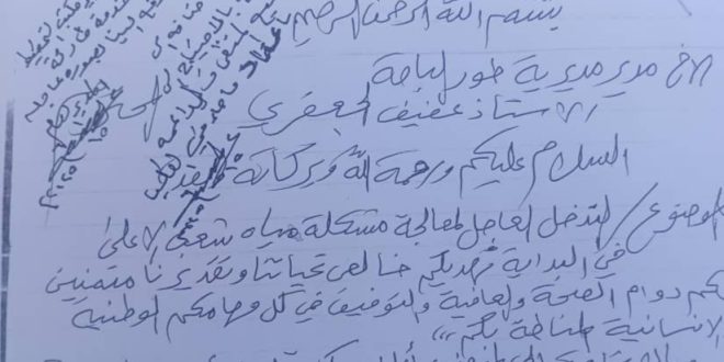 وكان الشخصية الاجتماعية والمدنية، الاستاذ عيدروس حسن الشعبي ، قد سلم اليوم، مدير المديرية في مكتبة ، رسالة من أهالي المنطقة، تتضمن شكوى من غياب المشاريع في المنطقة ، وكذا طلبا بالتدخل العاجل لمعالجة مشكلة المياة بصورة سريعة وعاجلة.