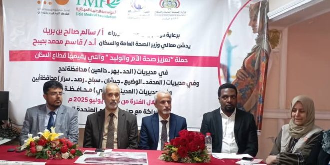 دُشن معالي وزير الصحة العامة والسكان الاستاذ الدكتور / قاسم محمد بحيبح بقاعة ابن سيناء بكلية الطب بخورمكسر ، صباح اليوم السبت، الموافق 26 يوليو 2025م ، الحملة الوطنية لتعزيز صحة الام والوليد، والتي يقيمها قطاع السكان، برعاية كريمة من معالي دولة رئيس الوزراء الاستاذ / سالم صالح بن بريك .
