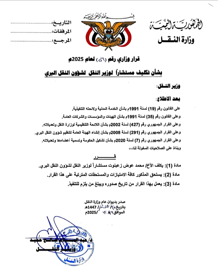 أصدر وزير النقل الدكتور عبد السلام صالح حميد ، امس الثلاثاء ، القرار الوزاري رقم (56) قضى بتكليف ، الاستاذ محمد عوض زعبنوت ، مستشارا لوزير النقل لشئون النقل البري .