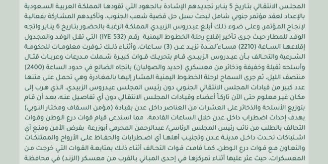 وأضاف المالكي أن الزبيدي أبلغ المملكة لاحقًا برغبته بالحضور بتاريخ 6 يناير، لكن أثناء تأخير إقلاع الرحلة، تحرك الزبيدي بقوات كبيرة تشمل مدرعات وأسلحة ثقيلة وخفيفة من معسكري حديد والصولبان باتجاه الضالع منتصف الليل، قبل أن يغادر إلى مكان مجهول تاركًا أعضاء المجلس الآخرين دون تفاصيل.
