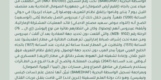 وبمراجعة تسجيل الواسطة البحرية (BAMEDHAF) تبين أنها تحمل علم (سانت كيتس ونيفيس)، وهو ذات دولة العلم للسفينة ( غرين لاند التي قامت بنقل عربات القتال والأسلحة إلى ميناء المكلا قادمة من ميناء الفجيرة بحسب ما ورد ببيان قيادة قوات التحالف المؤرخ في 30 ديسمبر 2025م.