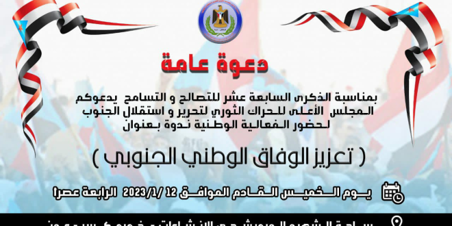 وجه المجلس الأعلى للحراك الثوري الجنوبي، الدعوة لجميع المثقفين والصحفيين والاعلاميين والمهتمين وناشطي الحراك السلمي، للحضور والمشاركة الفاعلة في الندوة السياسية التي يقيمها المجلس في العاصمة عدن الخميس القادم بعنوان (تعزيز الوفاق الوطني الجنوبي)، وذلك بمناسبة الذكرى السابعة عشرة للتسامح والتصالح الجنوبي.
